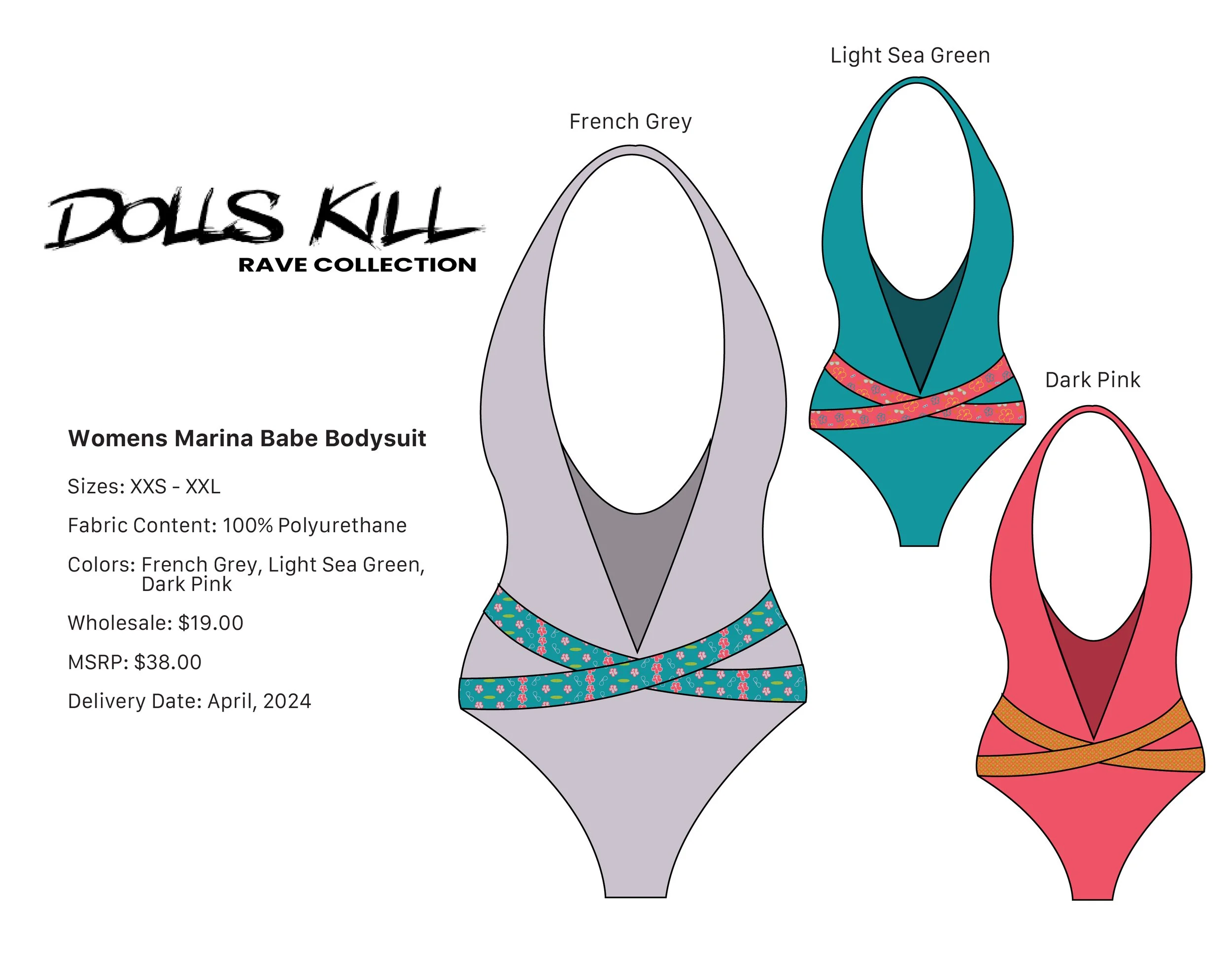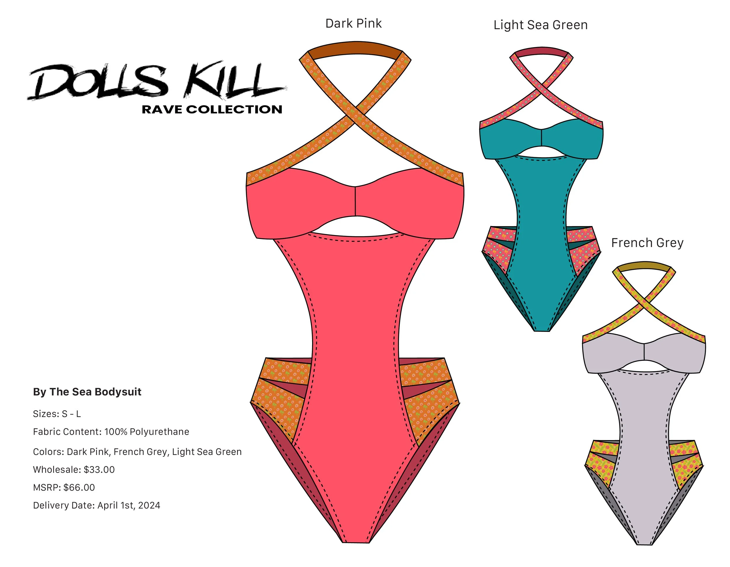 3) The process of creating these flats involved translating the collection's "Honolulu Rave" concept into eight functional, market-appropriate Dolls Kill silhouettes (bodysuits, flared pants, skirts, pashmina, dress). I meticulously used the developed textile prints (from your previous work) and the French Grey, Light Sea Green, and Dark Pink/Orange/Yellow neon palette to illustrate three distinct colorways for each garment, ensuring all relevant product information (fabric content, pricing, delivery) was accurately included on each page for a professional line sheet presentation.